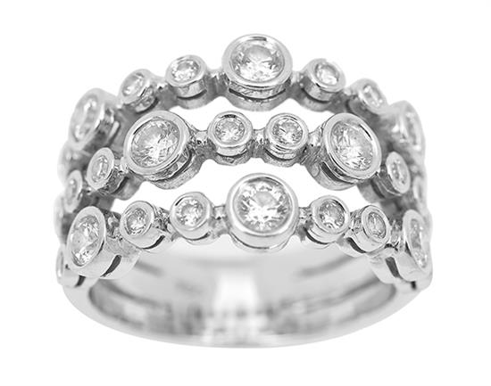 Comprising three pierced rows of collet set round brilliant cut diamonds totalling 1.32cts, mounted in 18ct white gold, ring size L.
