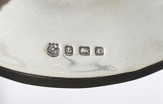 Of faceted tapered form, the domed-hinged cover with bell finial, both with wood scroll handle and reeded foot, total weight 895 grams, both 18cm high. Together with a silver ink well by Blanckensee and Sons Ltd, Birmingham 1918, weighted, (3).