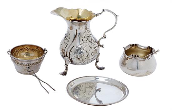 Together with a French silver sieve and tongs, silver coaster, weight 129 grams and a plated trinket vase (4).