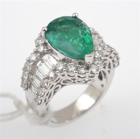 Centrally set with a pear cut emerald of 4.88cts, surrounded by round and baguette cut diamonds, mounted in 18ct white gold, ring size M-N.