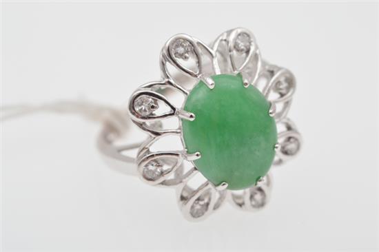 Centrally set with an oval jade surrounded by diamonds in a floral formation, mounted in 18ct white gold, ring size N.
