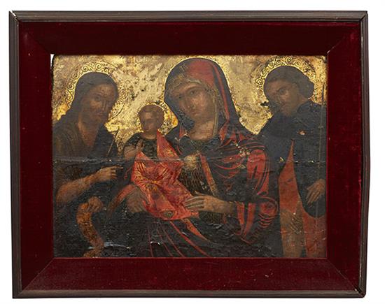 Tempera and gold ground on panel in later velvet mount frame 34cm x 44cm within the frame.