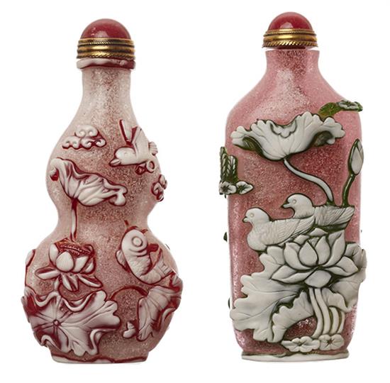 The white on pink ground bas-relief lead glass bottles, both decorated with lotus and Mandarin ducks, tallest 9.5cm high.