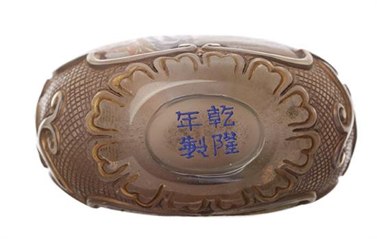 Lead glass flat bottle form, finely decorated with idyllic scenes, Qianlong mark to base, together with an amber glass bottle with lotus decoration, (2), tallest 8cm high.