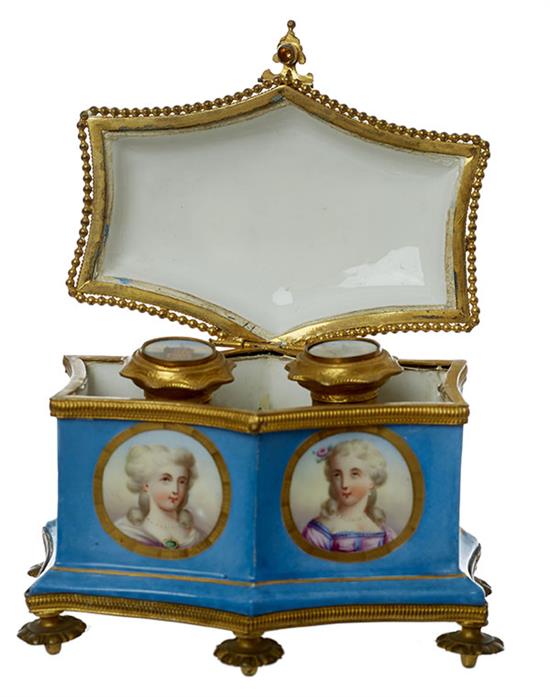 Embellished with cartouche of Marie Antoinette on a turquoise ground, with gilt metal mounts, fitted with enamel and gilt brass mounted glass ink bottles, 13cm width 10cm high.