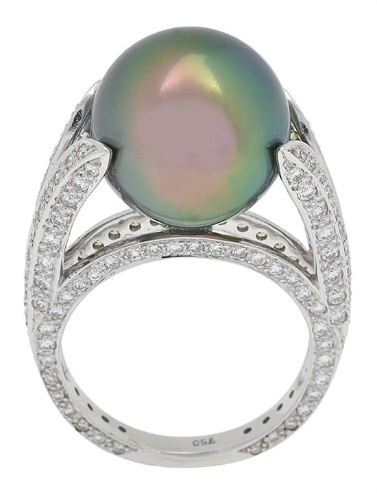 The round pearl of green purple hue measuring 14.00mm, raised in a diamond set frame, mounted in 18ct white gold, ring size N.