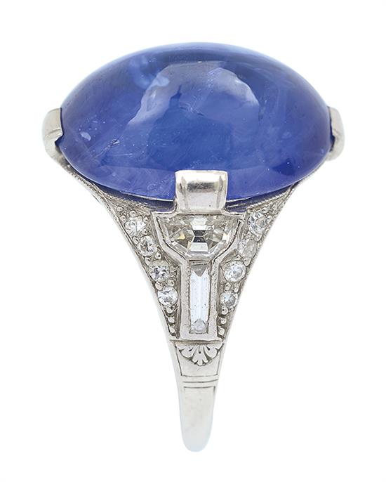The oval Sri Lankan sapphire of 10.00cts cut en cabochon, the shoulders set with shield, baguette and single cut diamonds, mounted in platinum, ring size L-M.