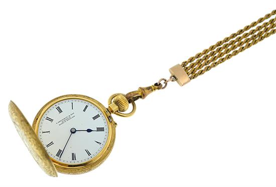 Crown wind and pin set movement, circular white dial with black Roman numerals, engraved 18ct gold case, signed dial and movement, dial signed C Rennison & Son, 33mm diameter, suspended from a gold lined double rope twist fob with swivel clip, total length 350mm.