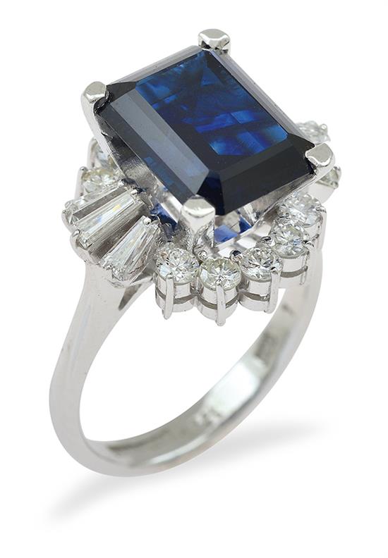 The emerald cut sapphire of 4.60cts, surrounded by baguette and round brilliant cut diamonds, mounted in white gold, ring size M.