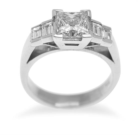 Centrally set with a princess cut diamond of 1.26cts, flanked by baguette cut diamonds totalling 0.36cts, mounted in 18ct white gold, ring size I.