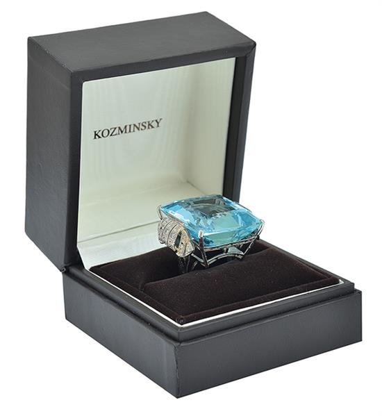 The cushion cut aquamarine of 83.90cts, having scroll decoration to the shoulders set with single cut diamonds, mounted in platinum and 18ct white gold, ring size O, retailed by Kozminsky.