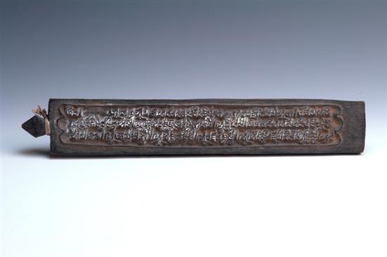 THREE WOODEN PRINTING BLOCKS, two Tibetan, the other a Nepalese prayer flag printing block, the largest 33cm x 5cm