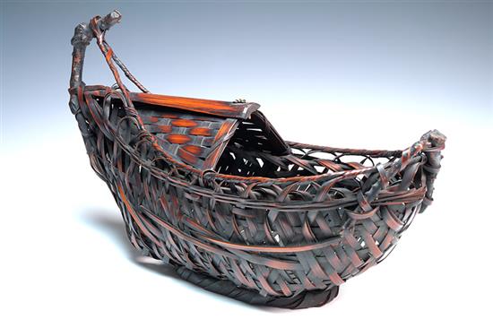 THREE PLAITED IKEBANA VESSELS, including boat, and two baskets The boat 38 x 15 x 27.5cm