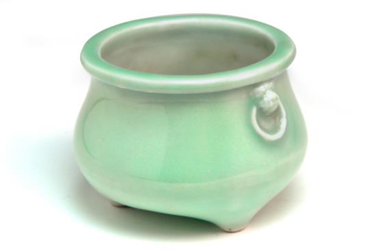 A COLLECTION OF CELADON GLAZED ITEMS, including small hibachi accompanied by bamboo tube, cherry blossom motif bowl and bulbous vase The bowl 19cm diameter