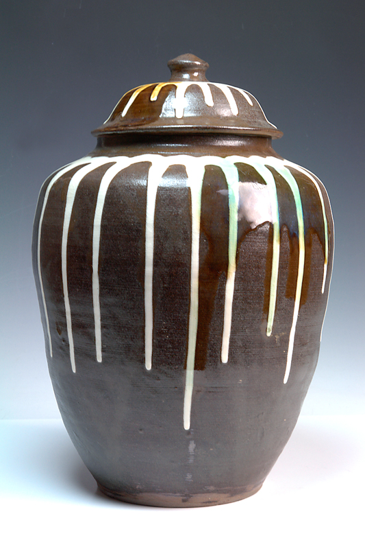 A COLLECTION OF EIGHT JAPANESE POTTERY OBJECTS, including tea pot, Kutani ware square vase, drip glazed dish, three lidded pots, five sake cups and an oribe tile