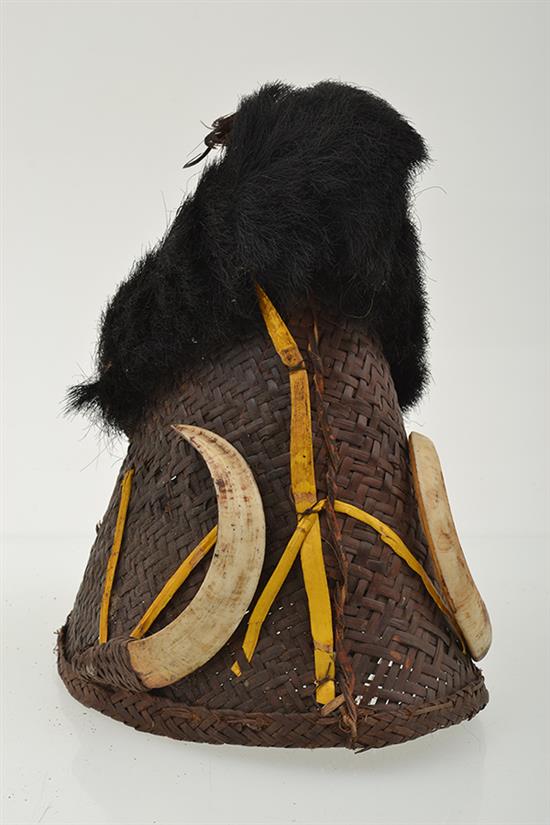 A COLLECTION OF NAGA TRIBE OBJECTS, including two horn belts, cobra armband, horn handled dagger, fibre hat, small bone figure and wood carved ancestor figure. The wooden figure, 78.5cm high