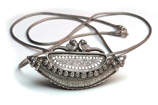 FOUR SILVER NECKLACES, including leaf shaped amulet, heart shaped amulet, oval shaped pendant and one other The longest 46cm, with pendant