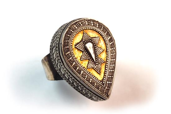 TWO TURKOMAN SILVER RINGS, finely worked beaded faces, one with brown glass underneath