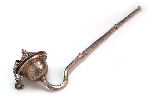 THREE SILVER ITEMS, including open work pipe, camel and pichkari The pipe 27.5cm long