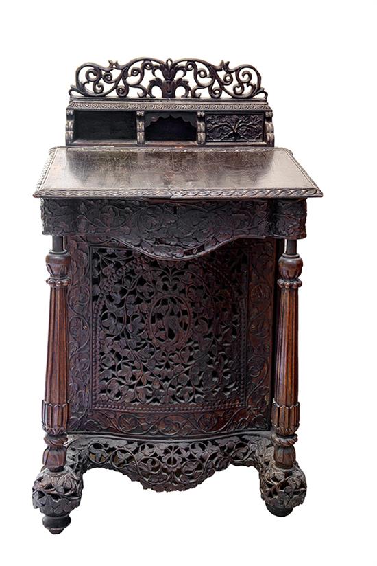 A 19TH CENTURY FINELY CARVED ANGLO-INDIAN DAVENPORT, with top drawer, two further small drawers, and side door, elaborate floral carving all over, made for a clerk of the East India Company, circa 1840. 105 x 58 x 60cm