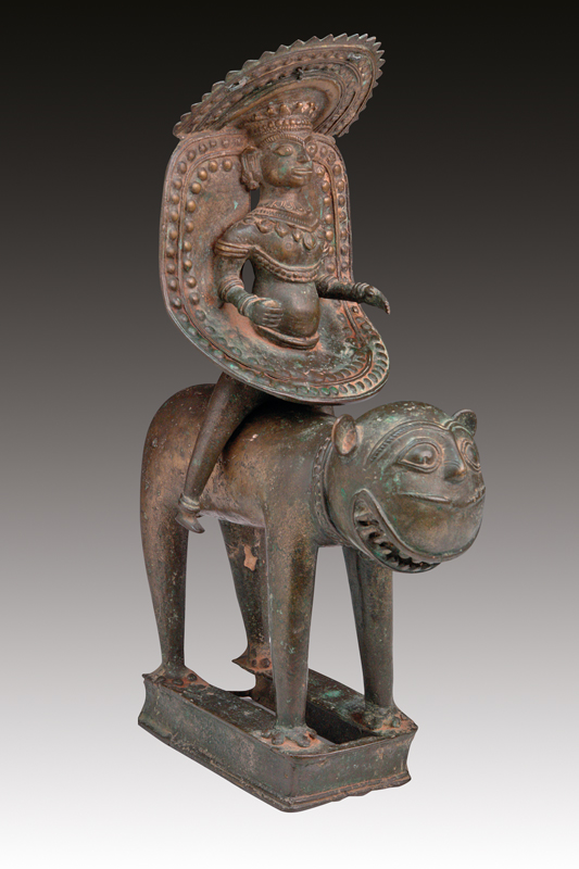 A TRIBAL DEITY ON A TIGER, tail missing, old repair to mandorla, collected from the Kerala-Karnataka border region 29cm x 16.5cm wide