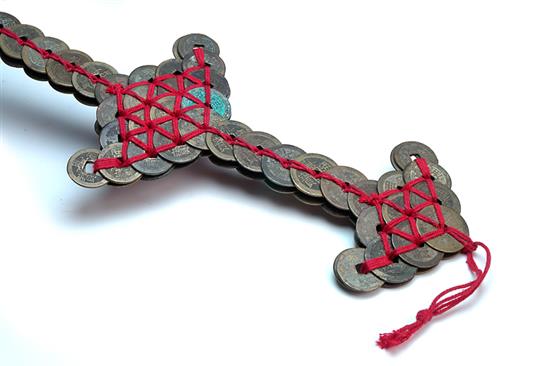 FOUR VARIOUS OBJECTS, including coin sword, wood/ copper water pipe, dragon head officers staff and history of tea bamboo slat wall hanging. The sword 52cm long