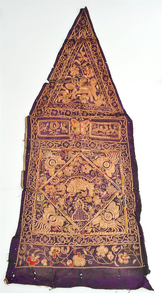 A MINANGKABAU TRIBE SUMATRAN BRIDE AND GROOM WEDDING PENDANTS, the bridal pendant burgundy embroidered with gold-thread & sequins, a central stylised elephant, flowers, a butterfly, some minor damage. The Groom pendant purple with a central lion, four butterflies, birds and flowers, some damage