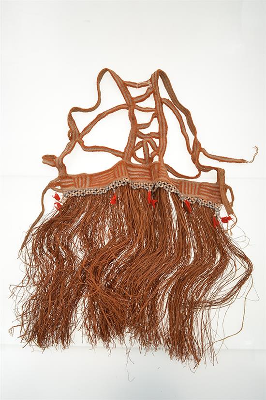 AN ASMAT TRIBE GRASS SKIRT, NECKBAND AND FIBRE CAP, along with two Asmat tribe reference books. The skirt 86cm long