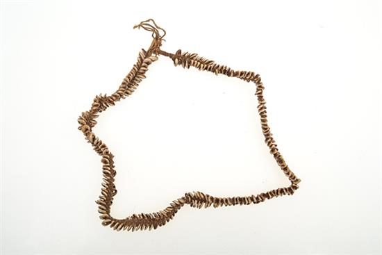 A COLLECTION OF NEW GUINEA BODY ORNAMENTS, including a highlands bailer shell chest ornament, sing-sing festival fibre dance mask, plaited vegetable fibre pouch, Chimbu cassowary crown, highlands fibre belt, gold lip crescent pectoral, nassa shell necklace and sepik forehead decoration. The pectoral 15 cm wide