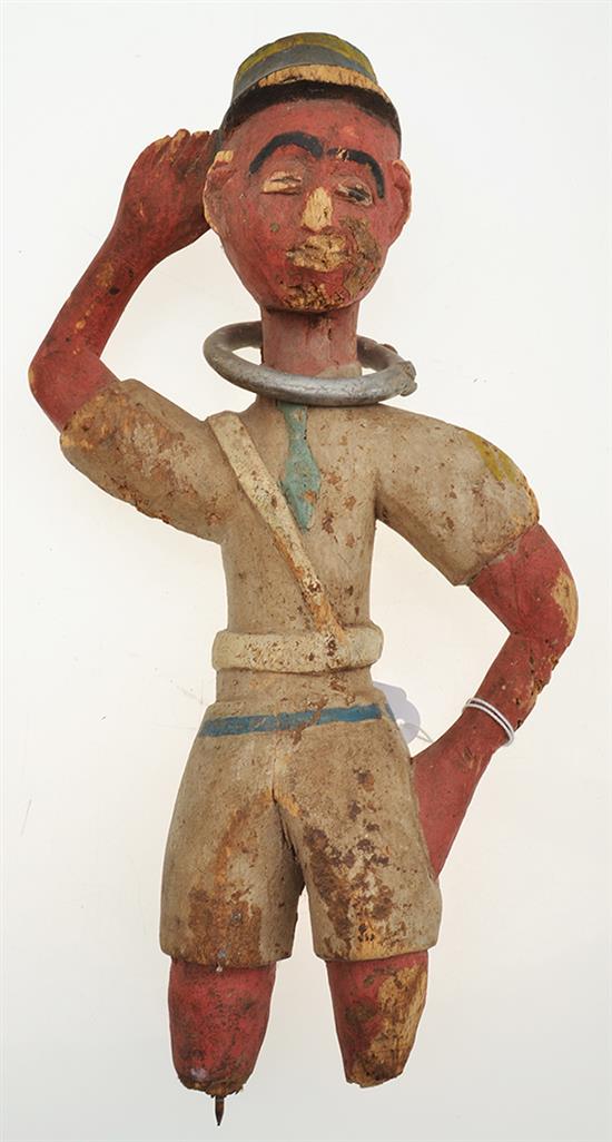 A COLLECTION OF AFRICAN OBJECTS, including Masai tribe calabash, Tanzanian woodcut print, Senufo tribe percussion instrument, Turkana tribe neckrest, Baule tribe carved legionnaire figure and Ethiopian neckrest, the latter 12cm high