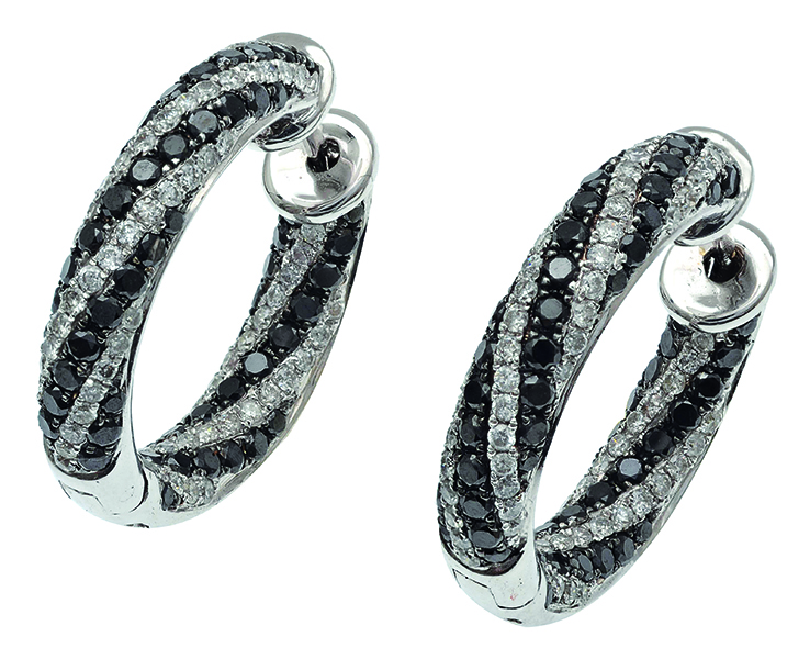 A PAIR OF BLACK AND WHITE DIAMOND HOOP EARRINGS