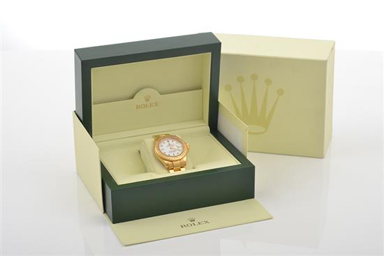Automatic thirty one jewel movement, circular white dial with applied illuminated baton numeral, signed case, dial and movement, 18ct gold case with rotating bezel and conforming bracelet bands, serial number 3/ 9815026, case reference number Y854408, Calibre 3135, total weight 176.6gms, diameter 44mm, with box.