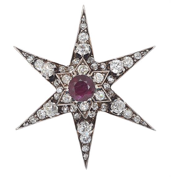 A VICTORIAN RUBY AND DIAMOND STARBURST BROOCH