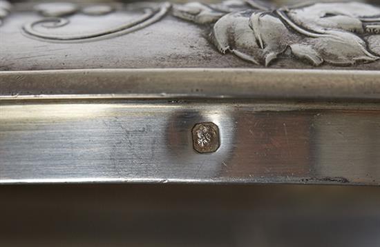 With acanthus scroll moulded handles and mounts interspersed with open work panels of flowers and cartouche, the lobed domed cover with fruit and foliate finial, silver weight 380 grams, 21cm width.