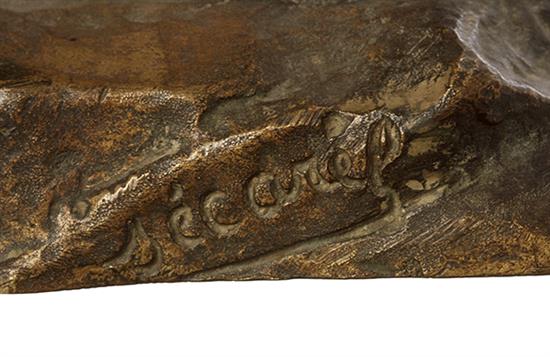 Depicted huddled in a long coat and holding a basket of fruit, engraved signature, 29.5cm high.