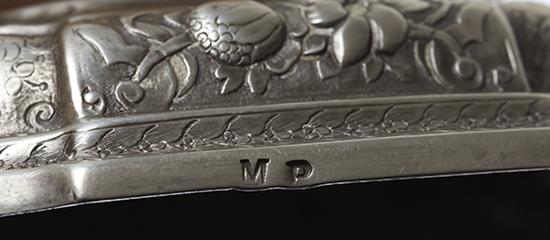 Finely cast in the Regency manner, the octagon sconces above baluster support with applied cherub masks and mermaid figures, the concentric stepped base with embossed floral and fruit panels, chassed throughout, hallmarked MP, probably provincial German silver, weight 563 grams.