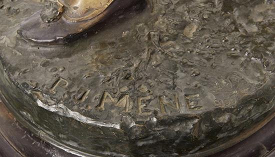 Modelled as a man in traditional Moroccan dress holding aloft a falcon with its catch of a hare below, set upon a naturalistic form base engraved J.P.Mene 10/100 F.Barbedienne, 67cm high including marble plinth.