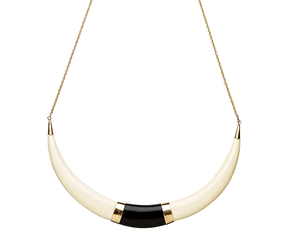 AN IVORY AND BULL HORN SUITE Comprising a necklace and a pair of earrings, having 14ct gold detail.