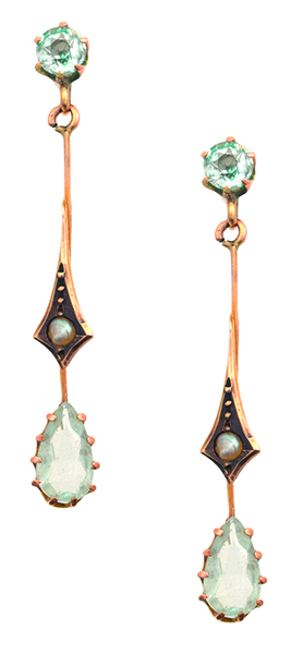The scroll frame set with six round and pear cut aquamarines and three round cut white sapphires with seed pearls set throughout, mounted in 15ct gold, together with a pair of accompanied aquamarine earrings in gold.