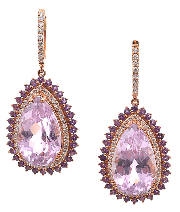 Each featuring a pear cut kunzite of 14.46cts, surrounded by round brilliant cut diamonds and amethysts, mounted in 18ct rose gold.