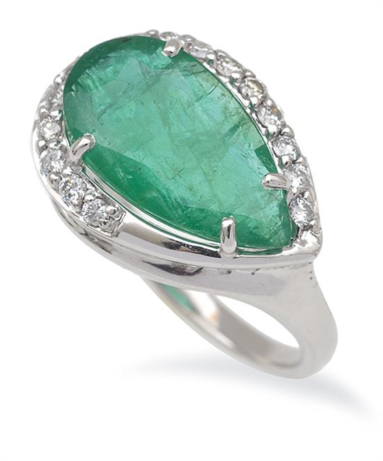 Horizontally set with a pear cut emerald of 3.05cts, surrounded by round brilliant cut diamonds, mounted in 18ct white gold, ring size N.