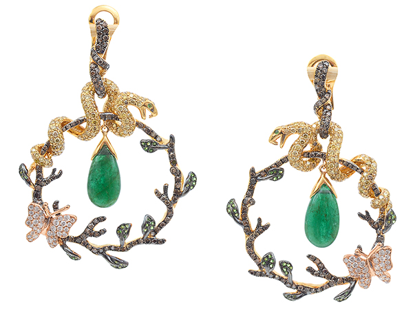 Each of naturalistic design, featuring a coiled snake and butterfly amongst foliage set with yellow, white and brown diamonds and green garnets, having a central emerald drop cut en cabochon, mounted in 18ct rose and oxidised gold.