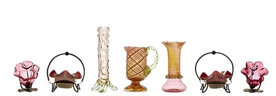 Comprising; satin ruby biscuit barrel, a pair of frill neck blush stem vases, a vase, a jug, two posy vases, two pairs of salts and a bonbon dish and cover, tallest 32cm, (12).