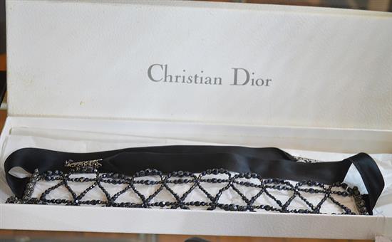 The belt styled with faceted black beads, silver metal detail and black ribbon, together with a pair of clip on earrings set with black beads, total length of belt 95cm, with box.