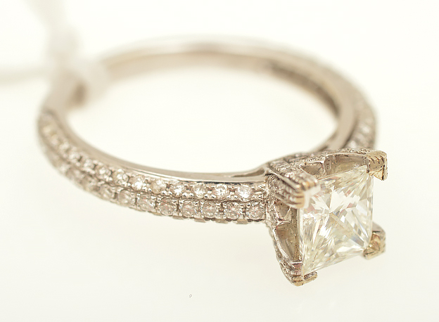 The princess cut diamond of 0.95cts, having pave set diamond shoulders totalling 0.70cts, mounted in 18ct white gold, ring size L.