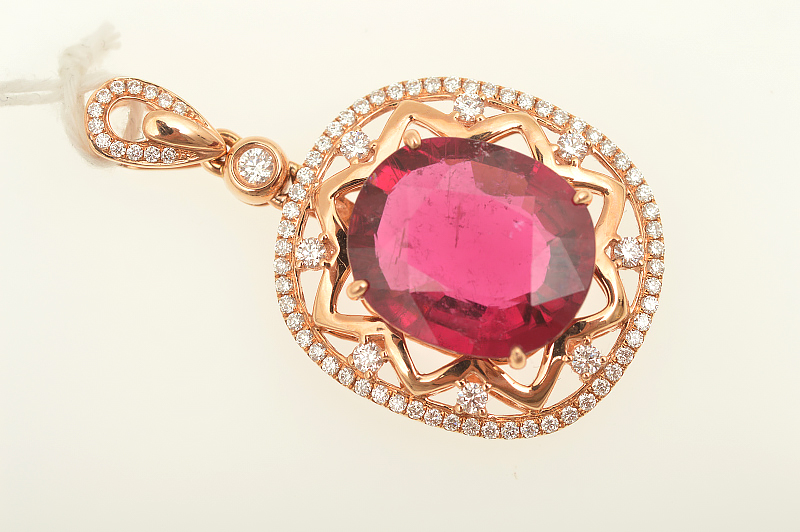 Centrally set with an oval cut rubellite of 8.77cts, set in a pierced frame surrounded by round brilliant cut diamonds, mounted in 18ct rose gold.