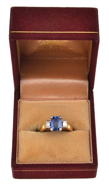 The emerald cut blue sapphire of 2.14cts, flanked by two baguette cut diamonds, mounted in 18ct gold, ring size M, boxed.