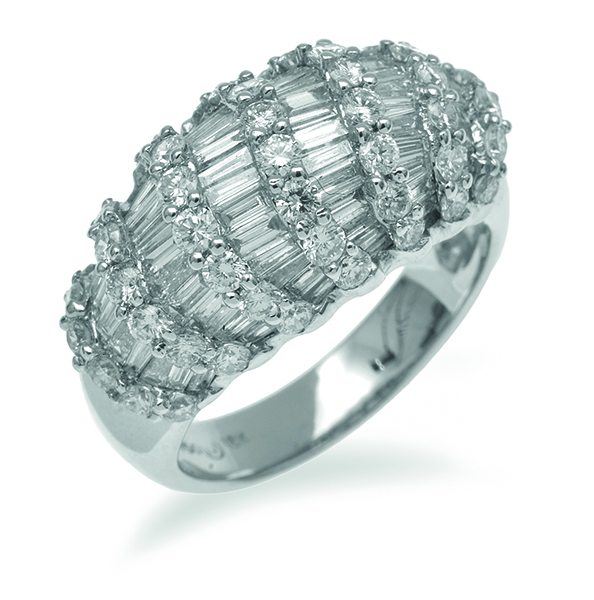 The domed ring set with baguette and round brilliant cut diamonds, in 18ct white gold, ring size N.