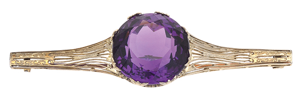 Centrally set with a round amethyst of 27.40cts, mounted in a pierced tapered gold frame.