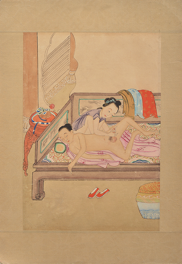 ink and colour on paper with gilt highlights, depicting amorous couples in interiors, at times with other figures watching to the side, the floral arrangements in the background providing subtle double-entendres to the principle scene